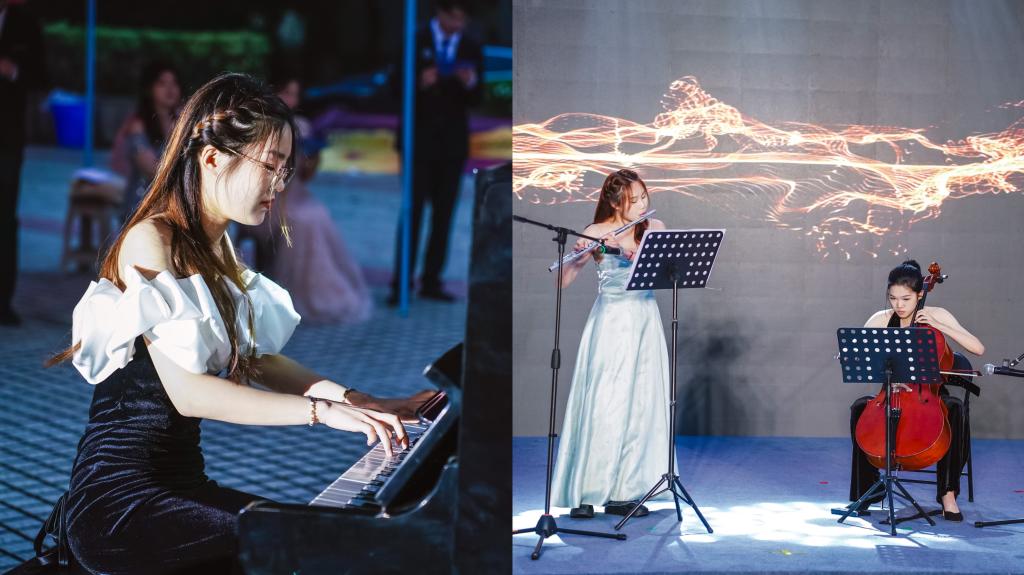 文艺汇演在《国风鼓乐》中拉开序幕。现代舞《Yes ok》点燃全场,展现极具青春个性的青年风采。歌曲《再见》《上春山》送给将要分别的朋友,以青春为名,伴清风而歌,扬起理想的风帆。三重奏《伦敦德里小调》以其优美的旋律和深邃的情感,带领我们穿越时空,感受不同文化的魅力。民乐《九儿》表达了中华儿女百折不挠、坚强不屈、保卫家园的精神。师生朗诵《有你的夏天》引发毕业生们回忆过往的校园生活,刻画了四年校园生活中的点点滴滴。歌舞《江山》带领师生们感受中国共产党与人民群众的鱼水之情。大提琴合唱《我爱你中国》启迪天平学子不忘初心,砥砺前行。快板《岳母刺字》讲述了岳母在岳飞的背上刺下“精忠报国”,激励青年学子永以报国为志,终身报效祖国。歌曲《像你这样的朋友》歌颂了友情的温暖,带着观众一起回忆成长中遇到的朋友。伴随着全场挥动的荧光灯,文艺汇演在合唱《快乐叮当》中圆满落下帷幕。