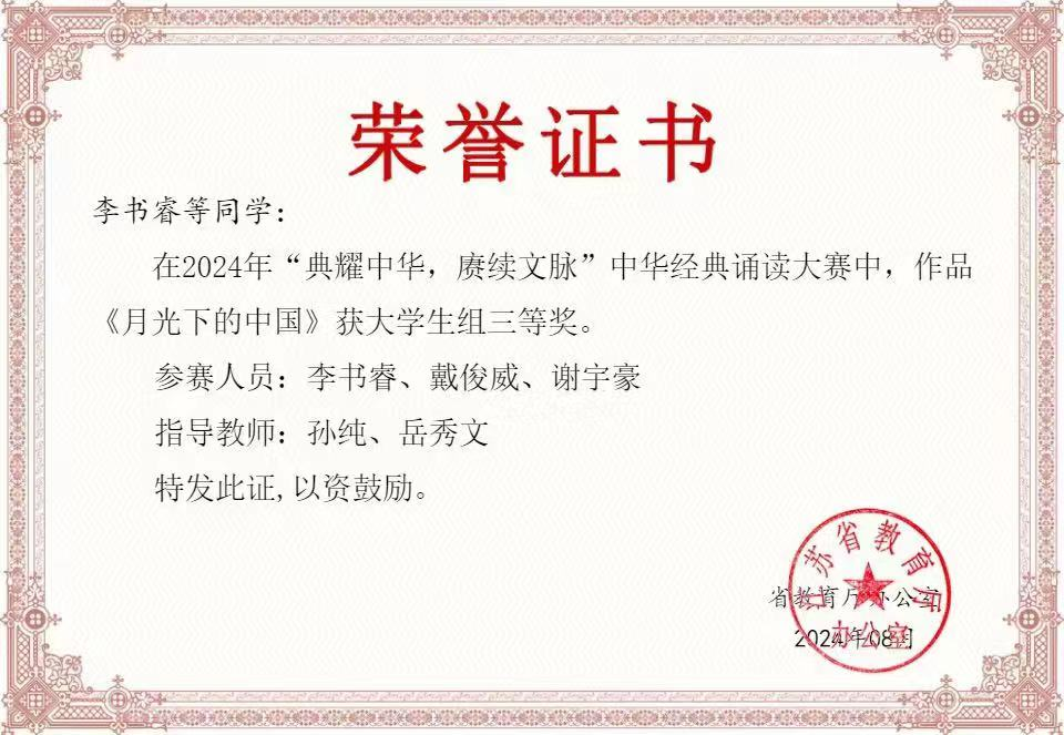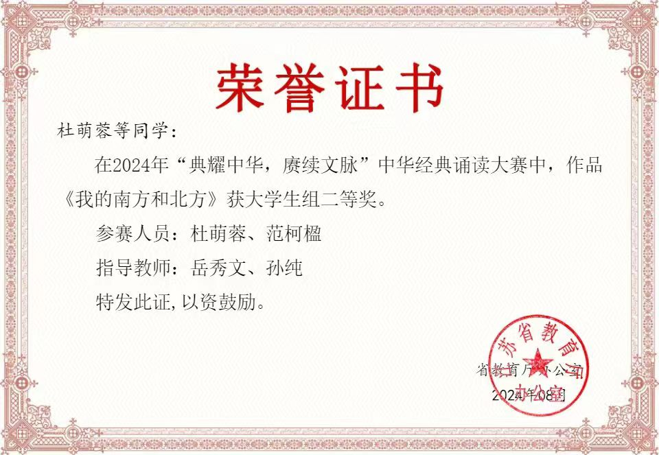 近日,“典耀中华 赓续文脉”江苏省2024年度中华经典诵读大赛获奖结果公布,由Beat365选送的两组参赛选手历经语言文字知识及诵读常识网络测评、录制诵读视频两个环节,最终获二等奖1项、三等奖1项,这一成绩在省内同类高校中名列前茅。本次大赛共评出特等奖3项、一等奖6项、二等奖12项、三等奖17项、优秀奖19项。