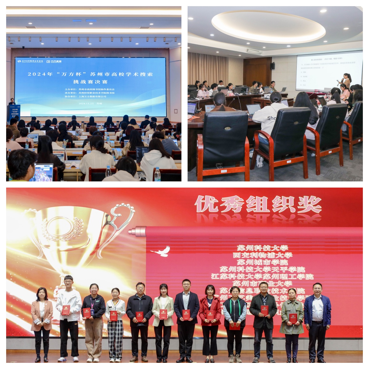 为进一步提高师生信息素养,促进学术资源的充分利用,提升高校图书馆的学术服务与组织能力,11月15日,“万方杯”2024年苏州市高校学术搜索挑战赛团体决赛在苏州经贸职业技术学院举行。来自苏州大学等7所本科院校和10余所苏州高职院校的代表队参加了本次比赛。