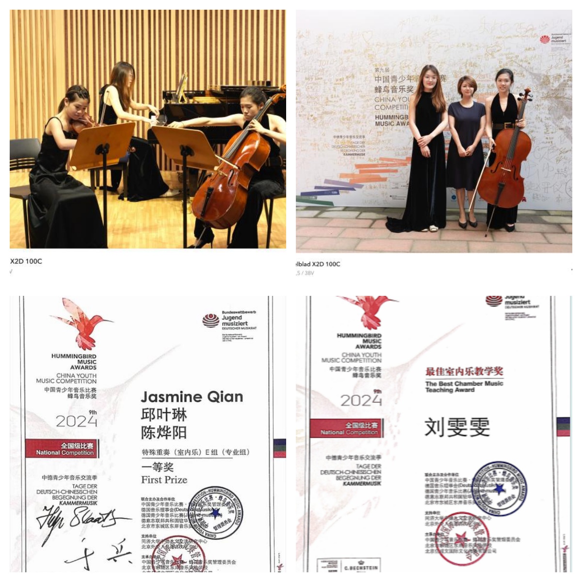 2024年7月21日下午,Beat365音乐学2322班邱叶琳和音乐学2221班陈烨阳代表江苏赛区参加了第九届中国青少年音乐比赛•蜂鸟音乐奖,获得了室内乐专业组一等奖的好成绩,并获得G.亨乐出版社原作版奖,刘雯雯老师获“最佳室内乐教学奖”。