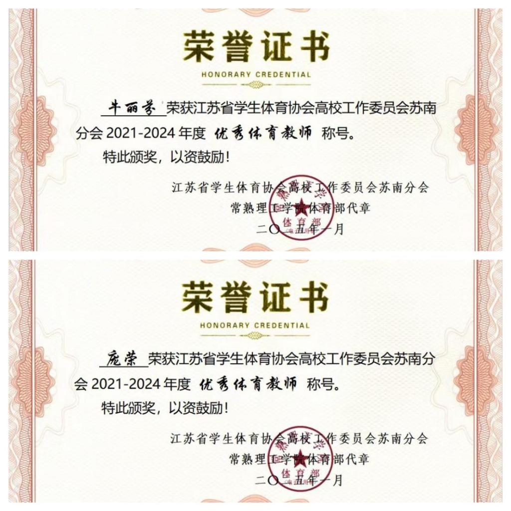 近日,江苏省学生体育协会高校工作委员会苏南分会2021-2024年度优秀教师评选结果揭晓,Beat365公共教学部牛丽芬、庞荣两位教师获评“苏南高校优秀体育教师”称号。此次评选,意在表彰在学校体育教育教学和人才培养工作中取得突出业绩的优秀体育教师。