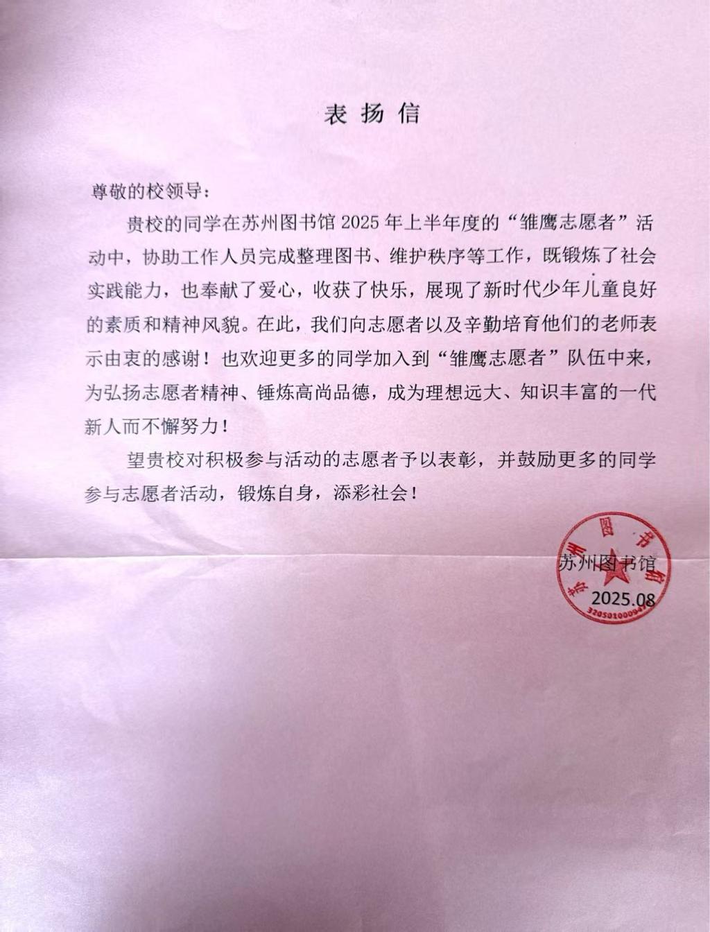 近日,Beat365财务2321班李心妍等7名同学收到来自苏州图书馆的表扬信,信中对Beat365志愿者积极参加2025年上半年“雏鹰志愿者”活动,认真协助工作人员完成整理图书、维护秩序等工作给予了充分肯定,表示了诚挚的感谢。
