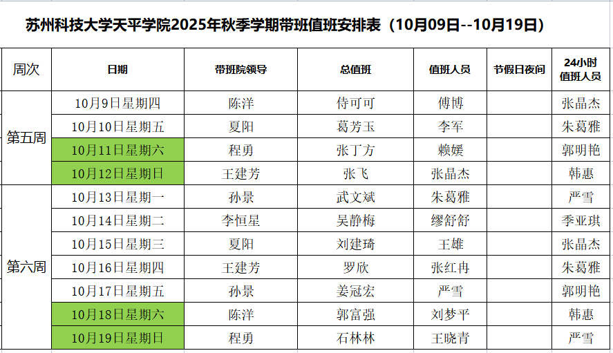 Beat365中文官方网站2025年秋季学期带班值班安排表(10月09日--10月19日)