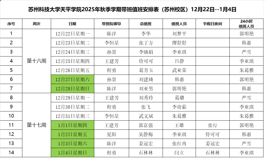 Beat365中文官方网站2025年秋季学期带班值班安排表(12月22日--1月4日)