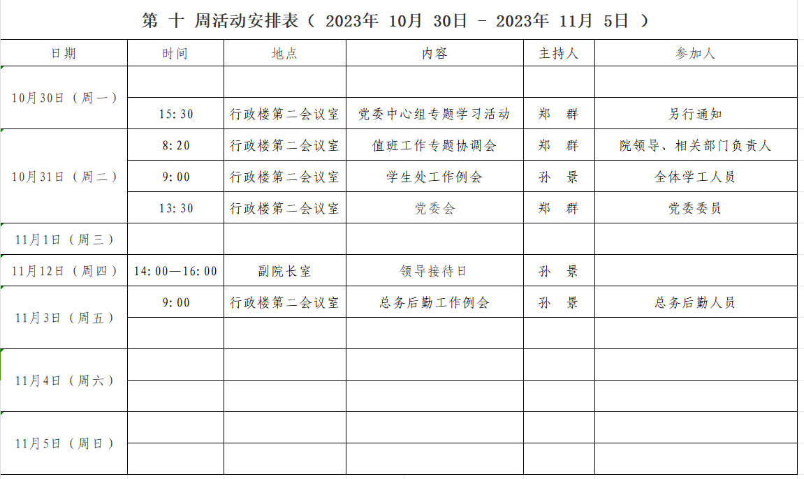 第 十 周活动安排表( 2023年 10月30日 - 2023年 11月 5日 )