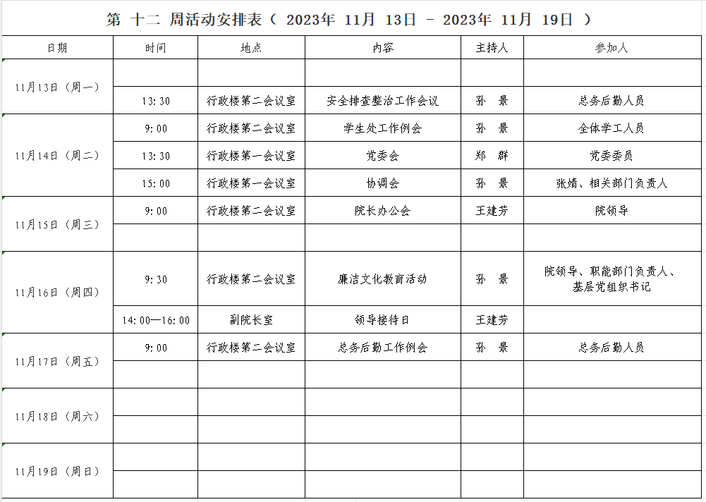 第 十二 周活动安排表( 2023年 11月 13日 - 2023年 11月 19日 )