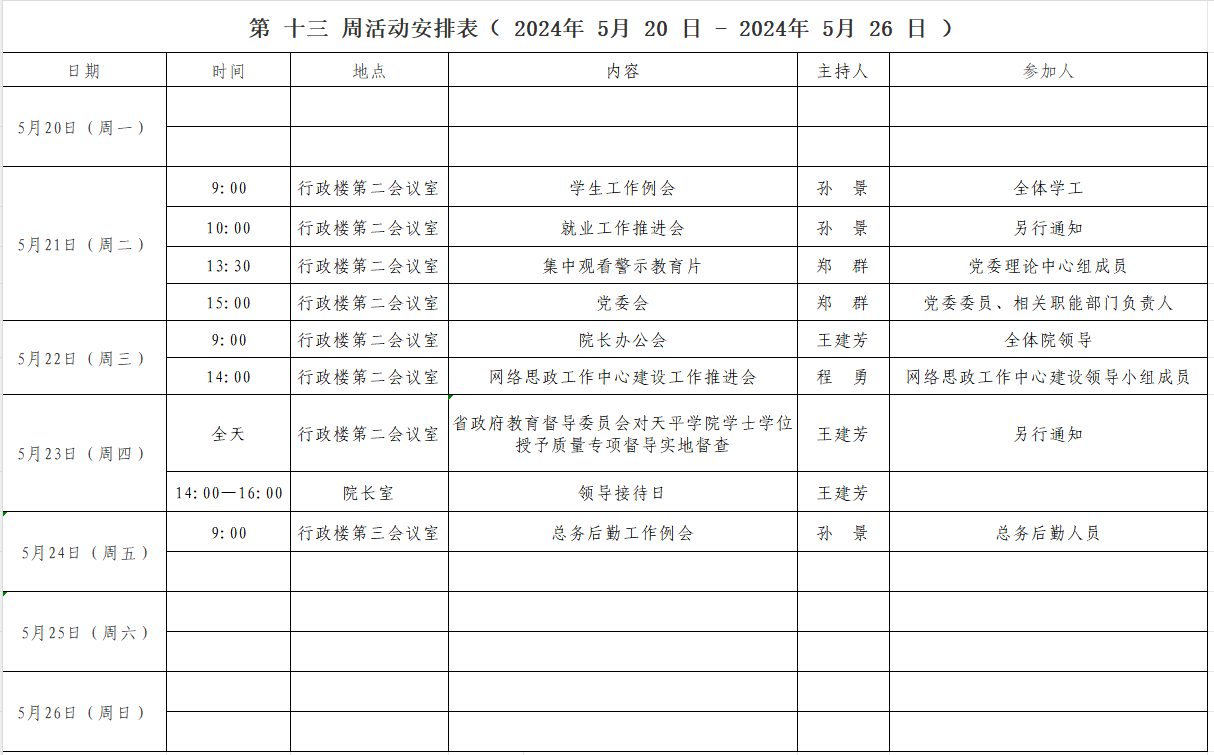 第 十三 周活动安排表( 2024年 5 月20 日 - 2024年 5 月 26 日 )