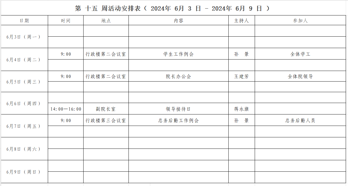 第 十五 周活动安排表( 2024年 6 月 3 日 - 2024年 6 月 9 日 )