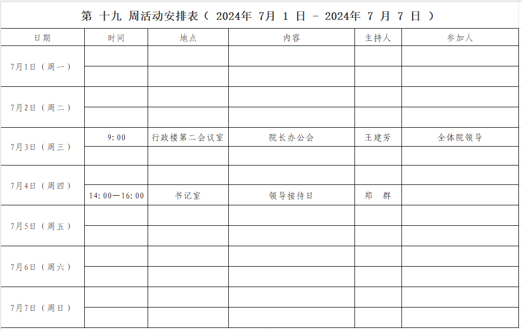 第 十九 周活动安排表( 2024年 7 月 1 日 - 2024年 7 月 7 日 )