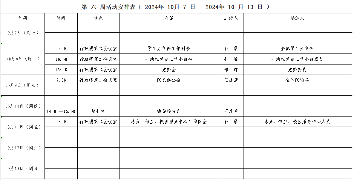 第 六 周活动安排表( 2024年 10 月 7 日 - 2024年 10 月 13 日 )