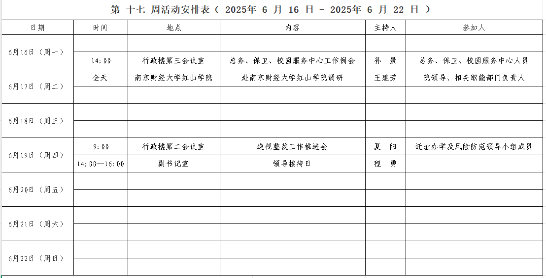 第 十七 周活动安排表( 2025年 6 月 16 日 - 2025年 6 月 22 日 )