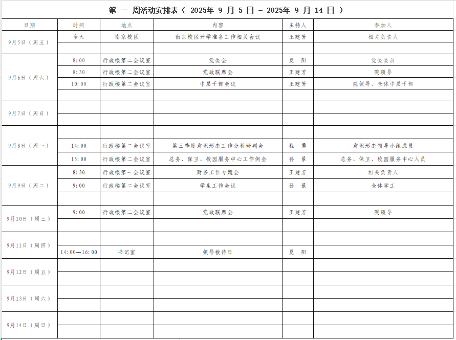 第 一 周活动安排表( 2025年 9 月 5 日 - 2025年 9 月 14 日 )