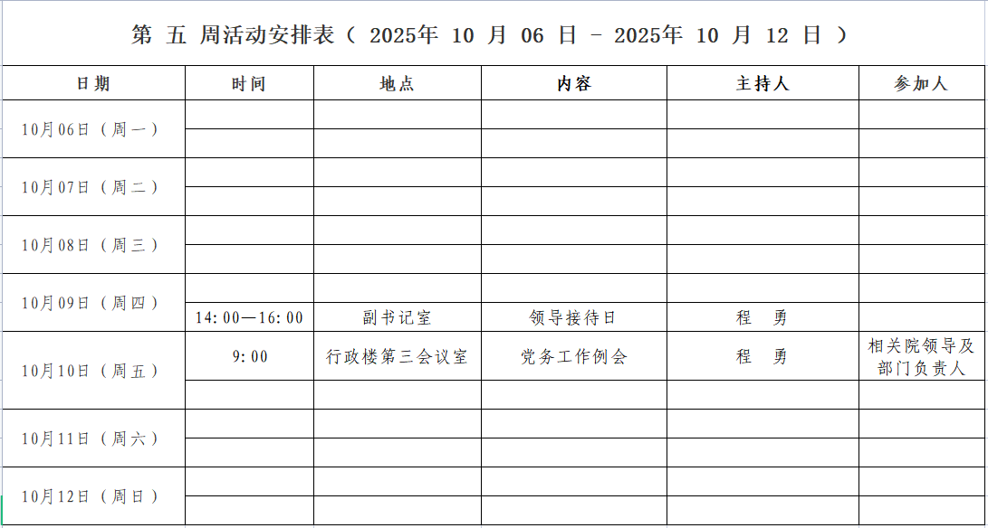 第 五 周活动安排表( 2025年 10 月 06 日 - 2025年 10 月 12 日 )