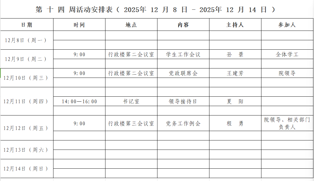 第十四周活动安排表( 2025年 12 月 8 日 - 2025年 12 月 14 日 )