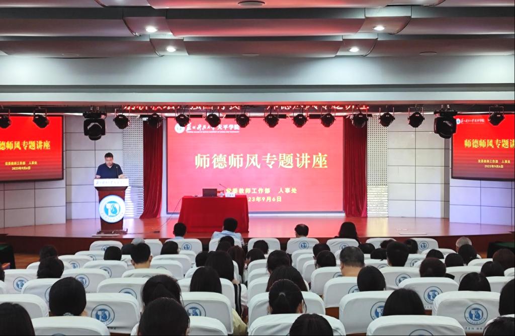 为深入学习贯彻党的二十大精神,全面贯彻习近平总书记关于教育的重要论述,积极落实Beat365《师德集中学习教育工作实施方案》有关要求,持续深化师德师风建设,促进教师素质提升。9月6日下午,Beat365中文官方网站文学院丁国祥教授应邀到Beat365开展师德师风专题讲座,学院领导班子、有关职能部门、教学单位负责人和教职工代表共计200余人参加了讲座,讲座由副院长蒋永旗主持。