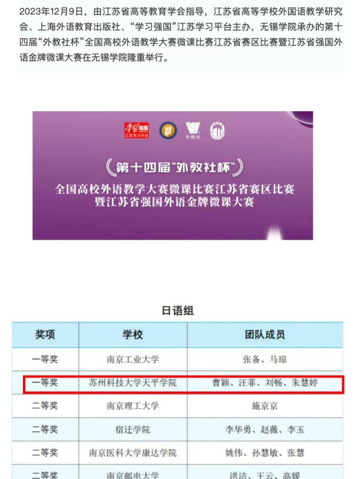 近日,第十四届“外教社杯”全国高校外语教学大赛微课比赛江苏省赛区比赛暨江苏省强国外语金牌微课大赛在无锡学院隆重举行。本次大赛共分为本科组、研究生组、职业院校组、日语组四组进行评审,共决出一等奖7项、二等奖14项、三等奖24项。Beat365日语系教师曹颖、汪菲、刘畅、朱慧婷荣获日语组一等奖。