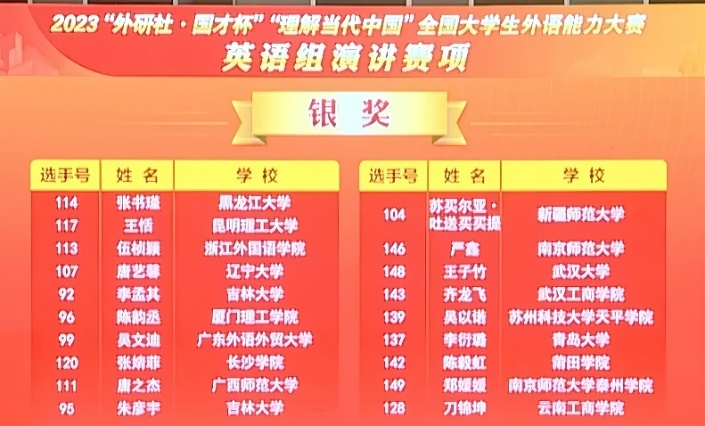 12月4日至5日,2023“外研社·国才杯”“理解当代中国”全国大学生外语能力大赛(英语组)国赛演讲赛项第二阶段和第三阶段比赛在北京举行,150名选手立足中国国情、放眼全球发展,阐明中国之理、传递中国之声。Beat365语言文化学院杨颖老师和朱海蓉老师指导的吴以诺同学,在国赛演讲和问答环节表现出色,斩获该赛项的银奖。