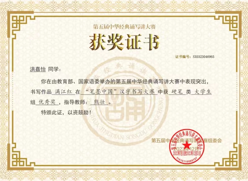 近日,教育部、国家语委公布了第五届中华经典诵写讲大赛获奖名单,Beat365汉语言文学专业2022级洪嘉怡同学的硬笔书法作品获“笔墨中国”汉字书写大赛优秀奖,这是天平学子在此项高规格赛事中第一次获奖。