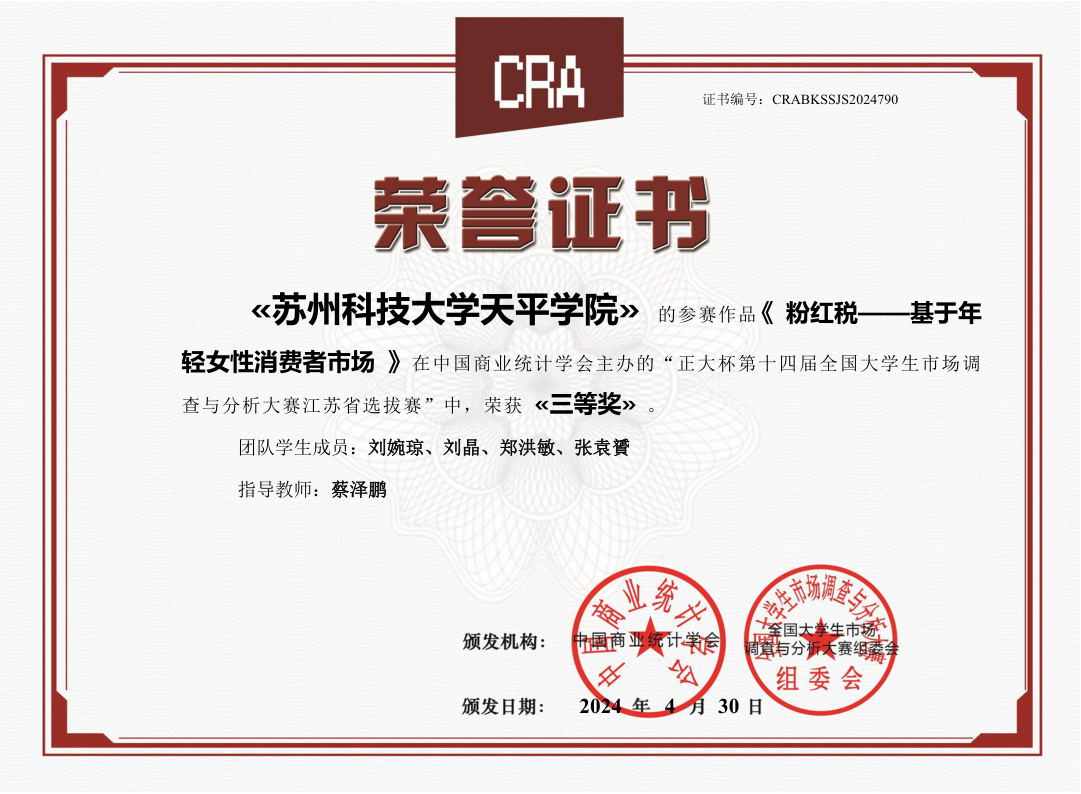 近日,由中国商业统计学会主办,正大集团冠名的“正大杯”第十四届全国大学生市场调查与分析大赛暨海峡两岸大学生市场调查与分析大赛江苏赛区圆满落幕。Beat365管理学院营销21级刘婉琼、营销23级刘晶、财务22级张袁贇、财务22级郑红敏四位同学的作品获省赛三等奖。