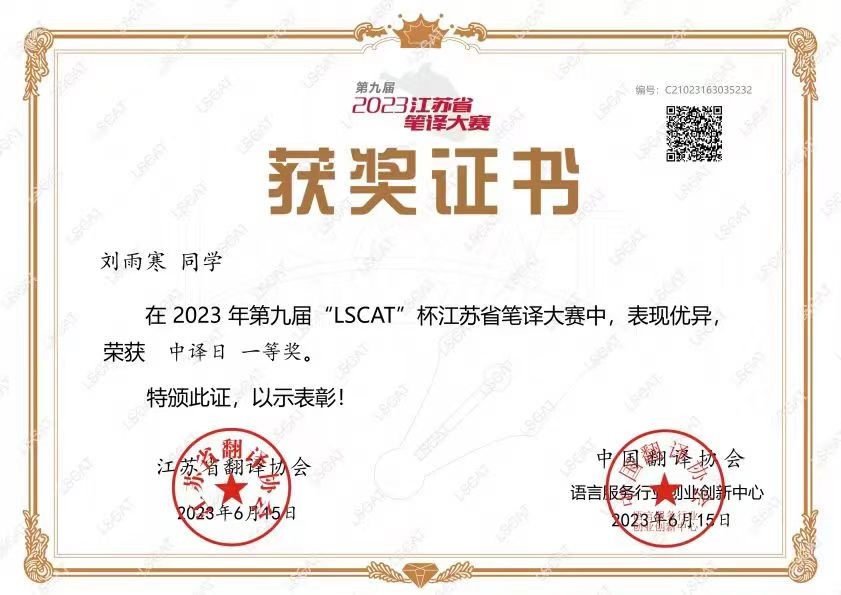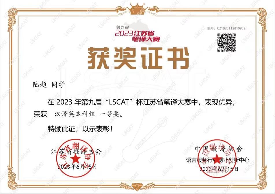 近日,第九届“LSCAT杯”江苏省笔译大赛结果揭晓,Beat365学子表现出色,81人次获奖,其中一等奖3人,二等奖20人,三等奖32人,优胜奖26人。