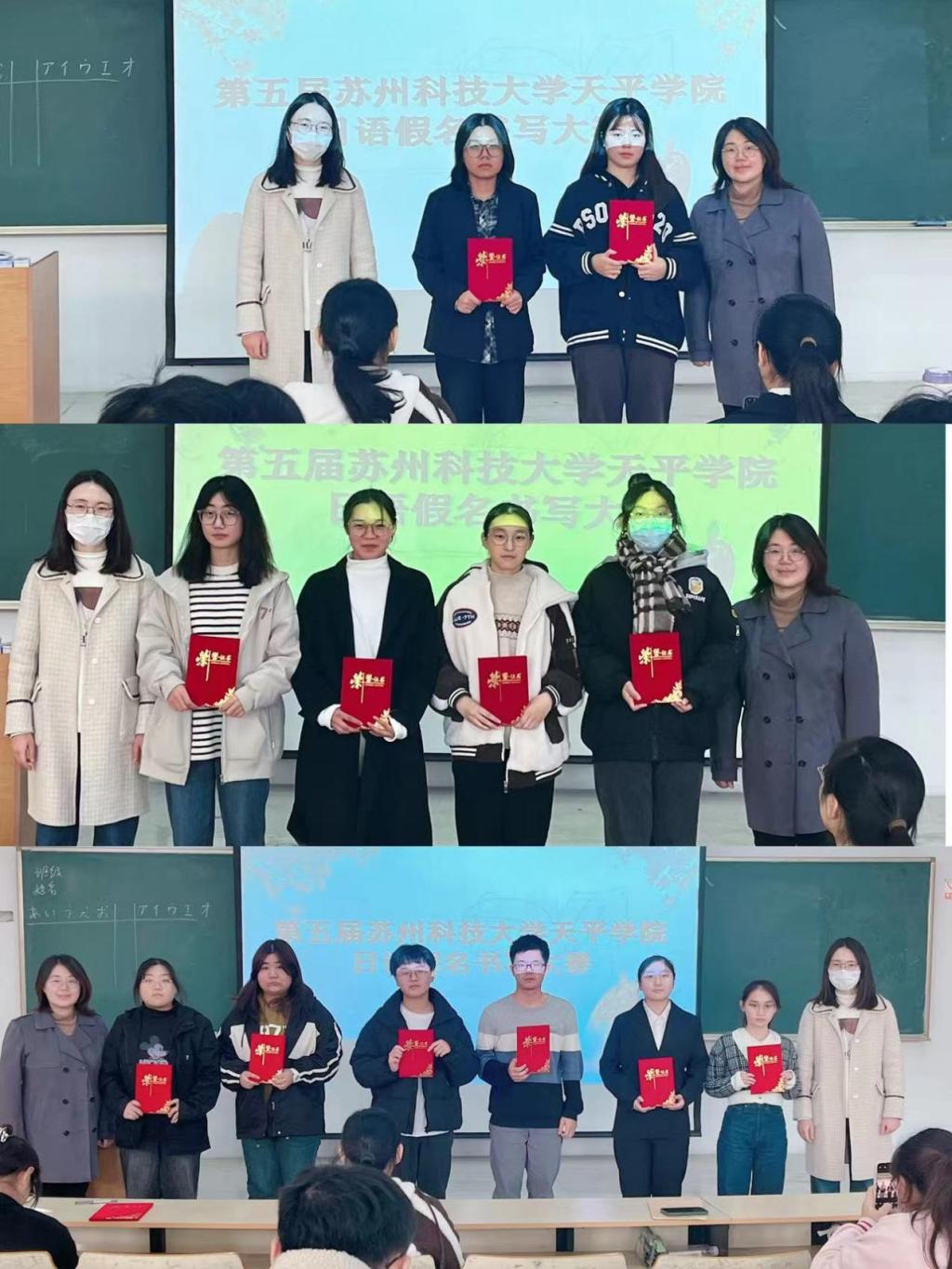 2023级日语专业全体学生参加了11月20日(星期一)下午1:30在天平校区J16举办的第五届假名书法大赛。本届大赛以“日有所练 书写美好”为主题,经过日语专任教师刘凯老师、汪菲老师的严格评审,比赛共产生一等奖2名,二等奖4名,三等奖6名。大赛的成功举办促进了学生规范用字、规范书写意识的养成。