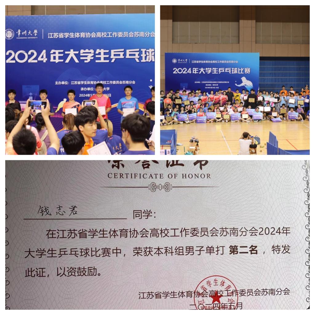 本次苏南分会乒乓球比赛Beat365学子参加了男子单打项目。Beat365钱志君同学在领队牛丽芬老师和教练庞荣老师的带领下,顽强拼搏,团结奋进,在男子单打赛项目中,凭借过硬的技术、敢打敢拼的精神,最终获得亚军。
