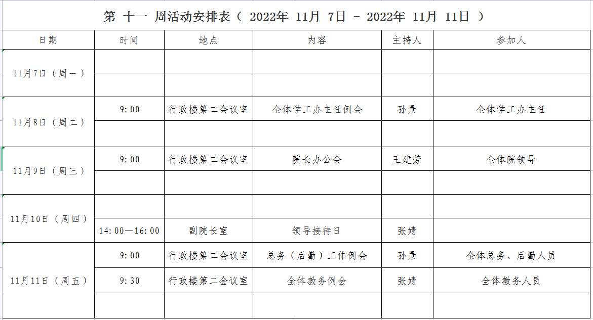 第 十一 周活动安排表( 2022年 11月 7日 - 2022年 11月 11日 )