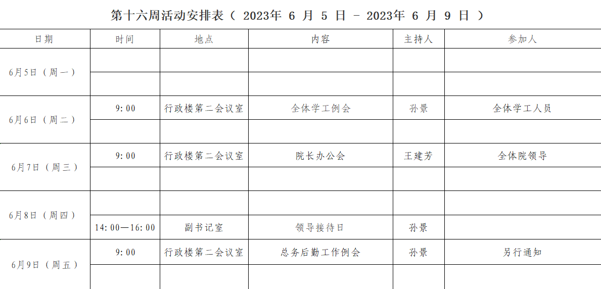 第十六周活动安排表( 2023年 6 月 5 日 - 2023年 6 月 9 日 )