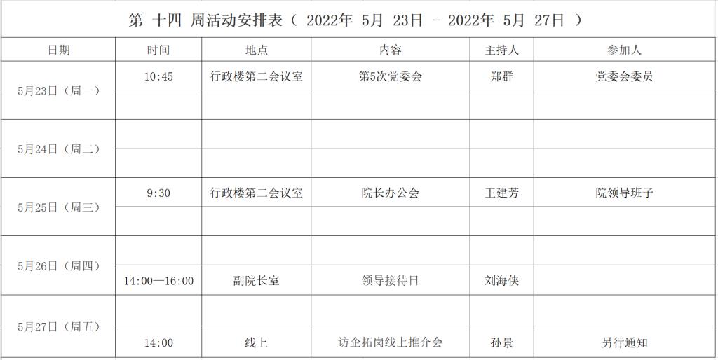 第 十四 周活动安排表( 2022年 5月 23日 - 2022年 5月 27日 )