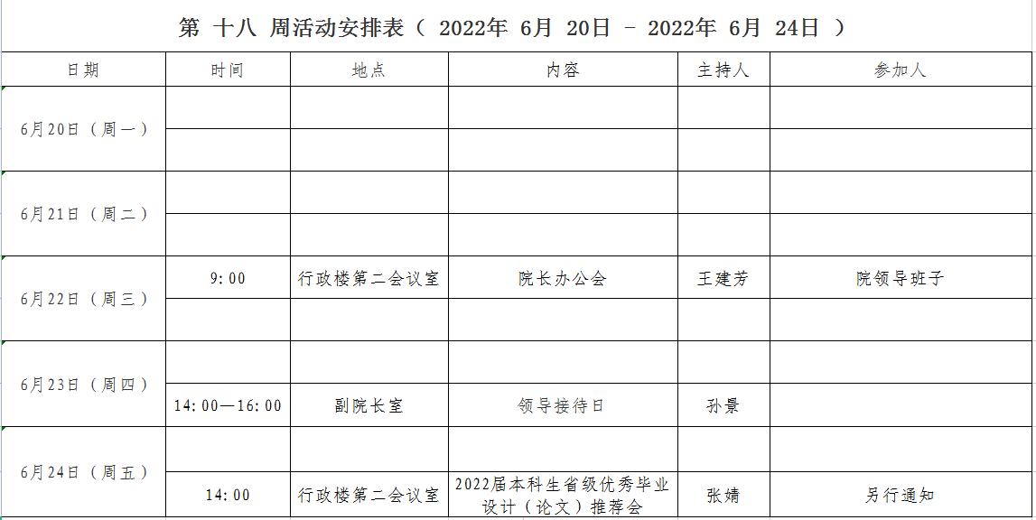 第 十八 周活动安排表( 2022年 6月 20日 - 2022年 6月 24日 )