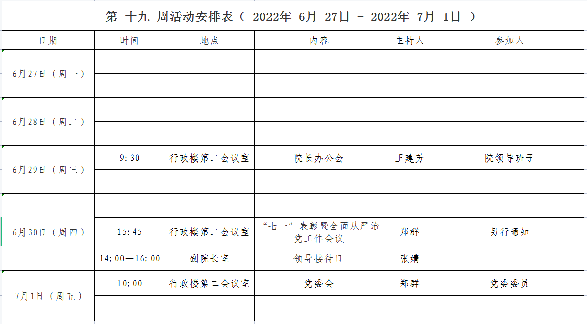 第 十九 周活动安排表( 2022年 6月 27日 - 2022年 7月 1日 )