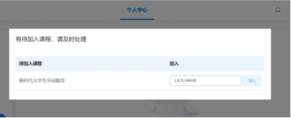 步骤二:完善账号信息后重新登录,页面跳出“有待加入课程”弹窗。学生将配套教材封底的“刮刮卡”刮开后,输入激活码,即可加入劳动教育课程。重修学生激活码可继续使用。