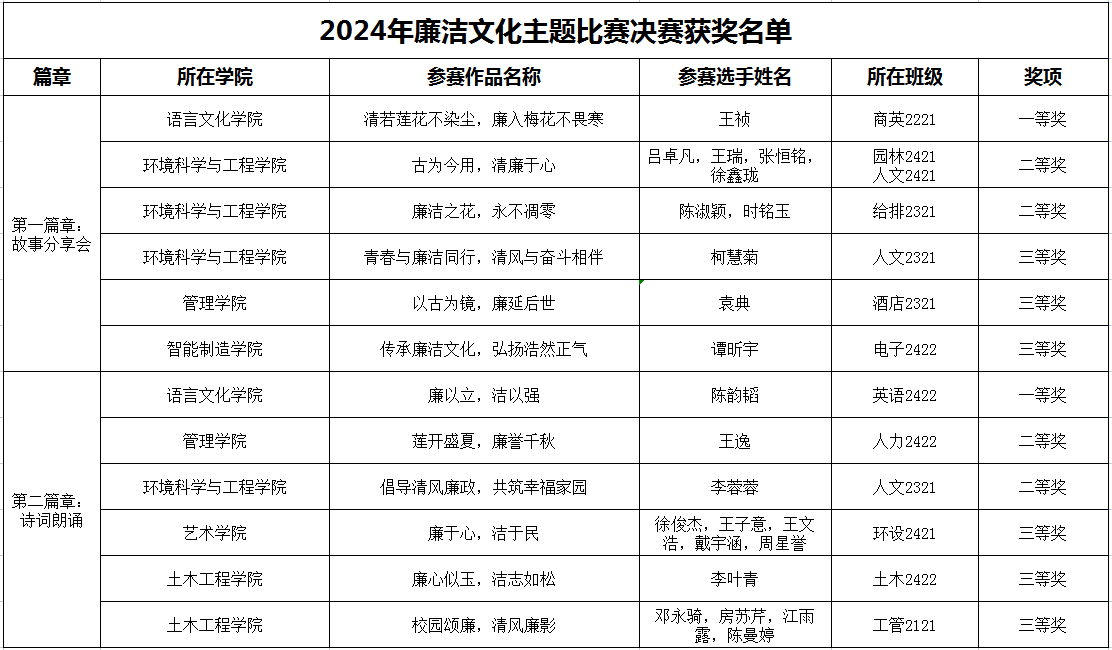 2024年廉洁文化主题比赛自启动以来,共收到60余件作品,经过二级学院初赛、校赛选拔等环节,共12件作品进入决赛。本次比赛共分为两个篇章,第一篇章:“书香润初心,共聚话清廉”故事分享会、第二篇章:“书香润校园,廉韵沁人心”诗词朗诵。