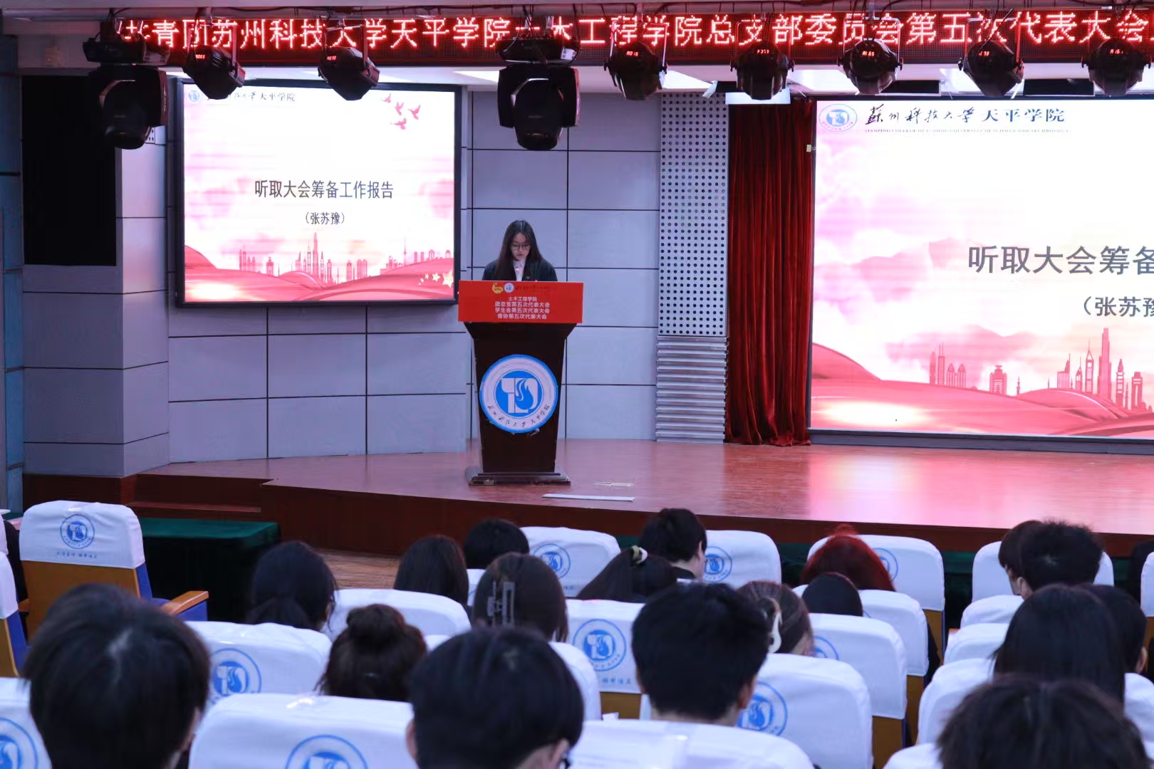 大会第一项议程,由张苏豫同学作大会筹备工作报告,审议通过筹备委员名单、代表资格审查委员会名单、大会选举工作人员建议名单,由吴佩霞同学向本次大会作代表资格审查报告并提交大会审议通过。