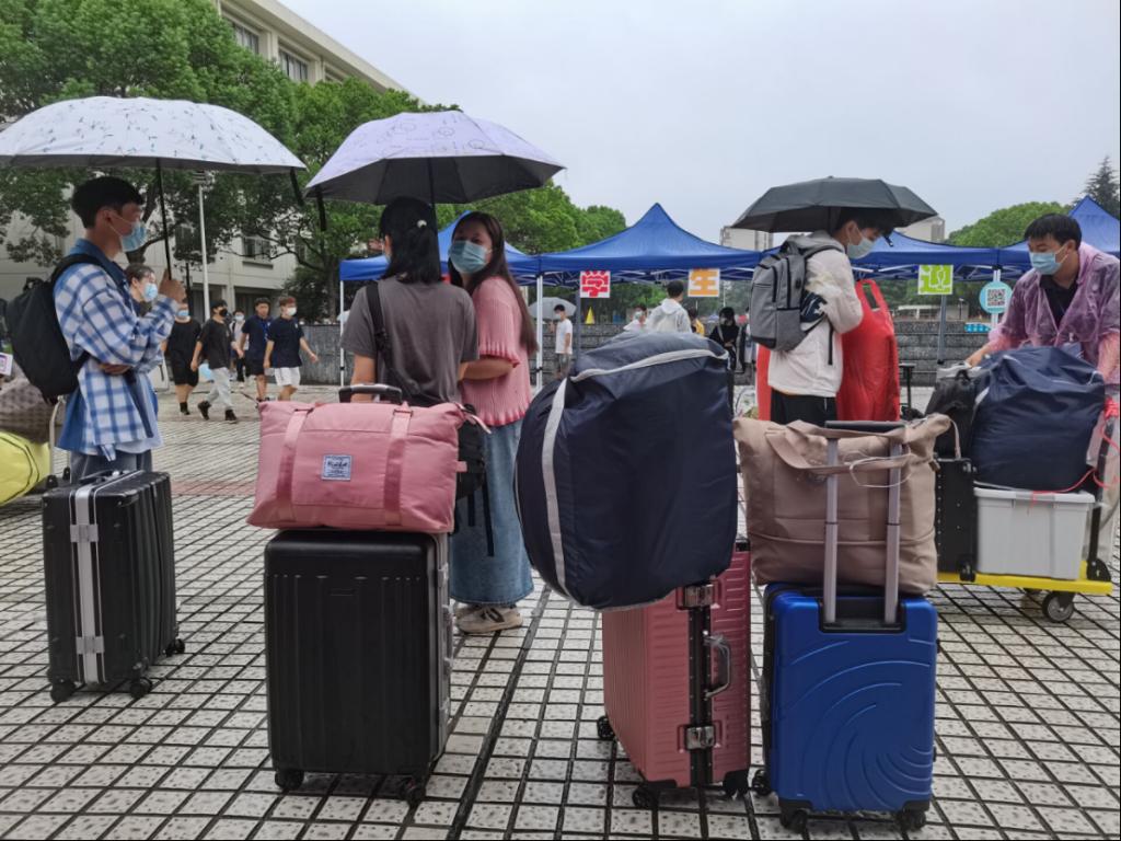 尽管当天天气状况恶劣,但是志愿者们没有任何懈怠,依旧热情地接待每一位新生,帮助他们搬运行李前往宿舍。校园里到处都是他们往返的身影。