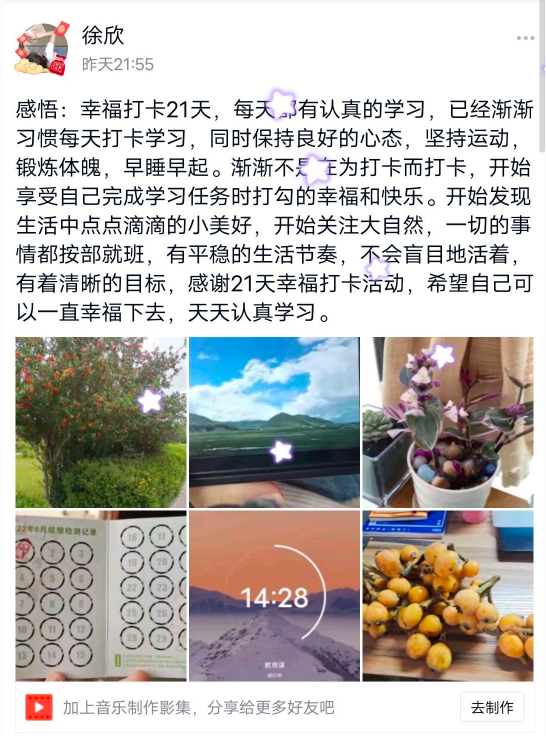 汉语z1923徐欣说:“渐渐不是在为打卡而打卡,开始享受自己完成学习任务时打勾的幸福和快乐。开始发现生活中的小美好,开始关注大自然,有平稳的生活节奏,不会盲目地活着,有着清晰的目标,感谢21天幸福打卡活动,希望自己可以一直幸福下去。”