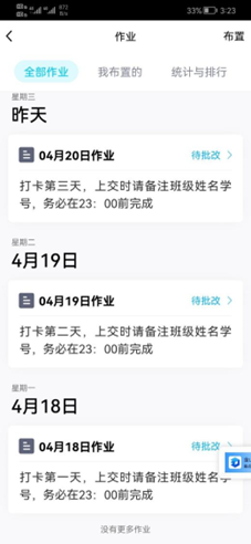 活动参与者需要在4月18日至5月8日期间坚持考研学习打卡,中间不得间断。打卡内容不限,同学们可以根据自身的计划制定课程学习笔记、每日时间安排、单词背诵等作为打卡内容。每日23:00前,参与者需要将自己的打卡内容上传到群作业,表示当天打卡完成。经过21天的打卡学习,葛咏琪、丁庆龙、杨淑芬等同学顺利完成这次的打卡任务。