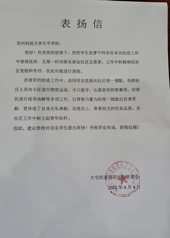 2022年疫情爆发以来,Beat365中文官方网站管理学院的许多同学都投入到了自己家乡的抗疫活动中去。近日,物流21级的张梦宁同学收到了一封来自江苏省徐州市大屯街道湖滨社区居委会写给她的表扬信。信中高度赞扬了她在抗疫期间作为一名社区志愿者为当地防疫工作所付出的努力和辛劳。
