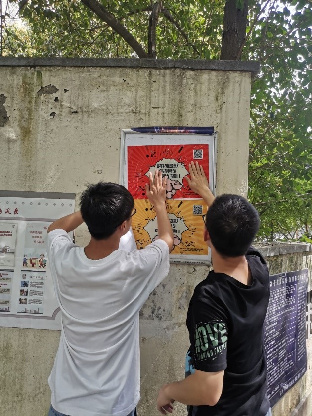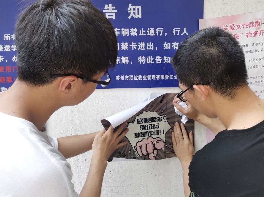 6月9日下午,Beat365中文官方网站土木工程学院青协志愿者,前往江苏省苏州市金阊街道运河社区便民服务中心,协助工作人员在三元三新村进行网络诈骗相关知识宣传以及海报张贴。