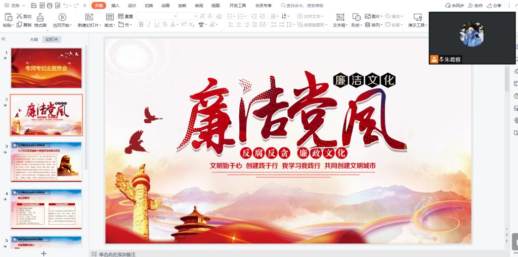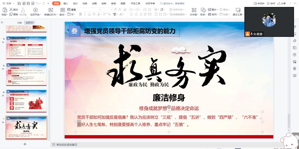 土木工程学院线上召开了主题会议,同学们都准时参与,朱老师向同学们认真地介绍了廉洁党风和求真务实。党风的端正廉洁对于开展党的日常教育,践行党的使命有着重要作用,切实纠正损害群众利益的腐败和不正之风,不断以作风建设新成效取信于民,推动党风政风持续向上向好。此次活动的开展,同学们学习、认识并将在自己生活中的体现出来,介于当前市场经济的趋利性逐步渗透到社会生活的方方面面,形形色色的价值观不断充斥同学们的生活,越是在这个时候,越要求我们保持清醒的头脑,保持我党艰苦奋斗的作风,将其发扬广大。