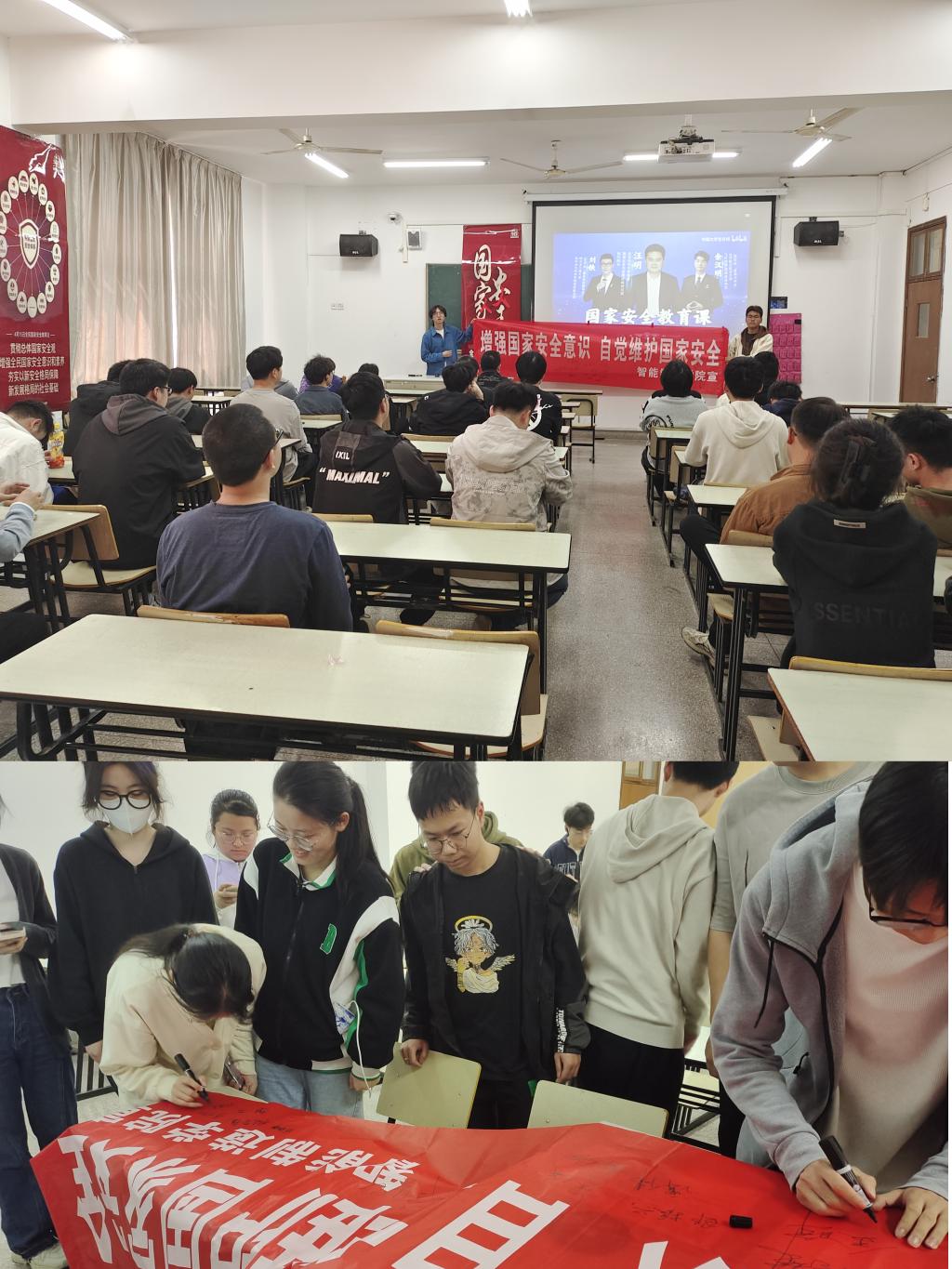 4月12日下午,积极开展了观影签名活动。活动中播放由真实事件改编的微电影视频,宣传普及了《中华人民共和国反间谍法》、《反间谍安全防范工作规定》、《公民举报危害国家安全行为奖励办法》等相关法律法规知识,观影结束后,同学们纷纷留下签名,此次活动让同学们对反间防谍、维护国家总体安全有了一定的认知和感悟。