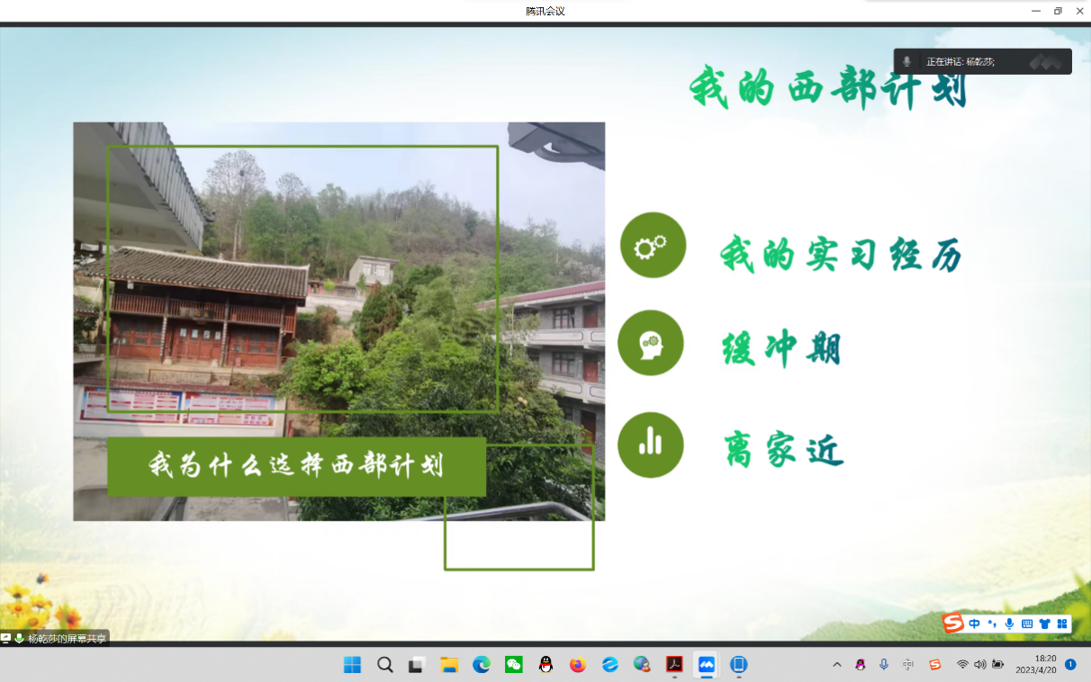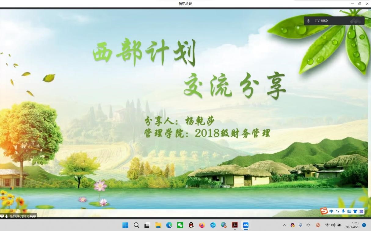 为进一步宣传乡村振兴计划、西部计划,更深层次动员Beat365青年大学生扎根基层、扎根西部,引导学生躬亲实践,管理学院团总支于4月20日晚召开了2023年“西部计划”、“志愿服务乡村振兴计划”线上宣讲会。