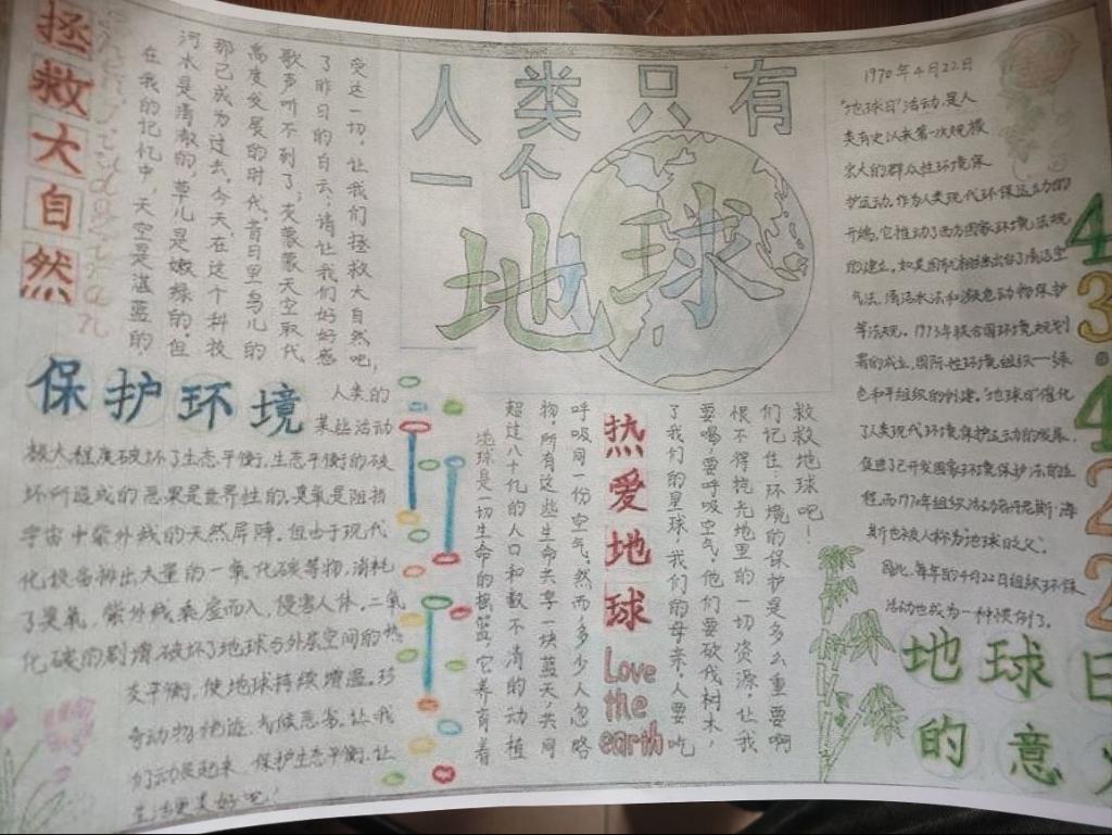 为迎接4月22日地球日的到来,语言文化学院青协分会于4月22日举办了一场别开生面的手抄报征集活动,用图文并茂的方式展现环境保护、节能减排、资源循环利用等主题,以此来唤起更多人对地球环境问题的关注。活动吸引了全校师生的热情参与,展现了校园内环保意识的蓬勃发展。