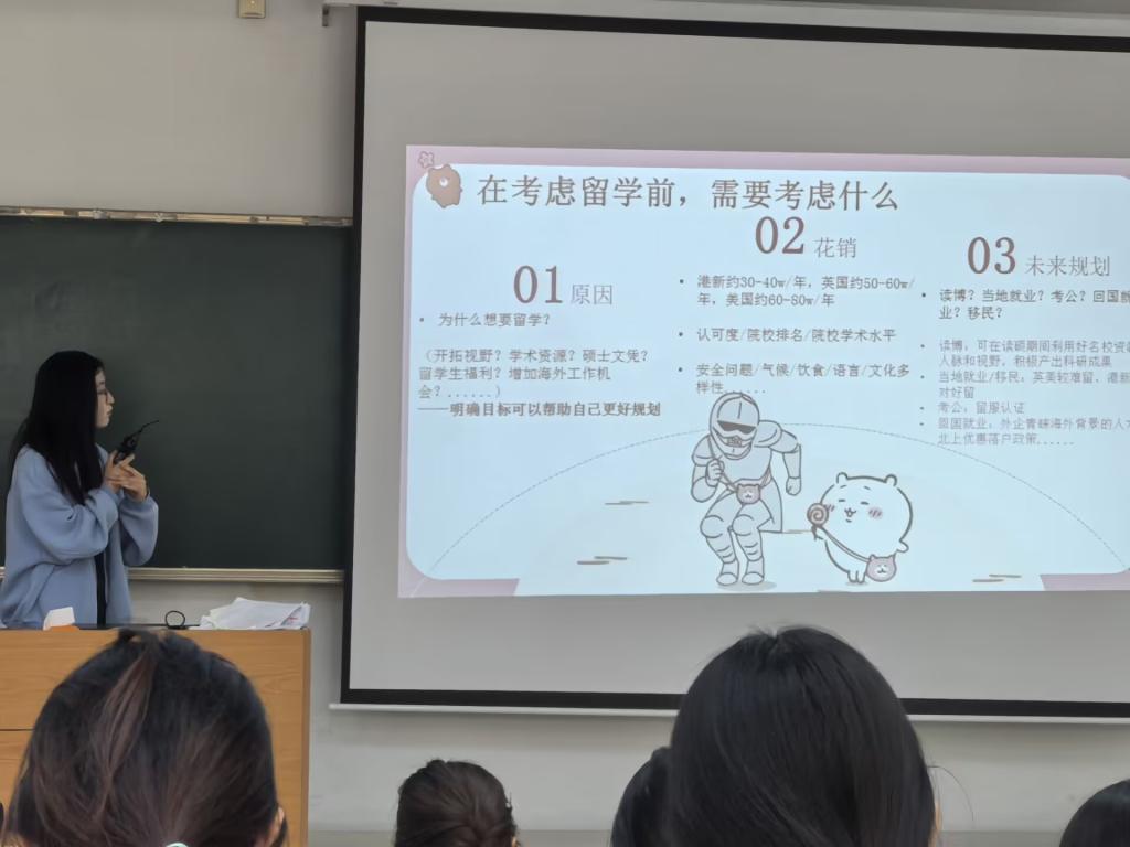 酒店21许雨欣同学成功申请香港教育大学。她详细介绍了留学申请的准备过程,从语言考试规划到学术背景提升,从院校选择到文书撰写,从专业方向到未来职业规划,从留学费用到奖学金申请......建议同学们尽早开始语言学习,制定合理的学习计划,利用课余时间参加科研项目、实习或志愿者活动,丰富个人履历。她的分享为同学们打开了升学的新视野,提供了更多元的选择。